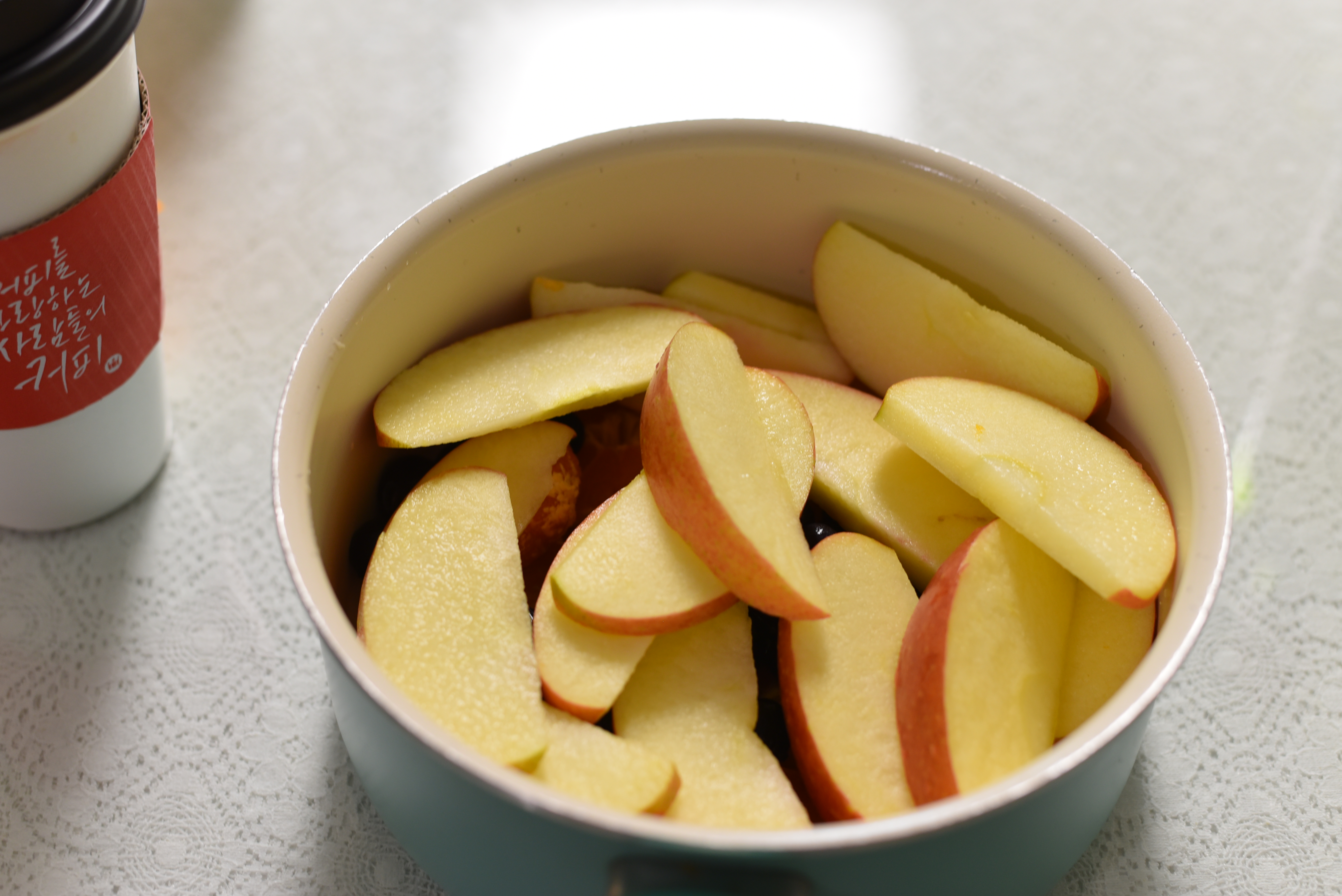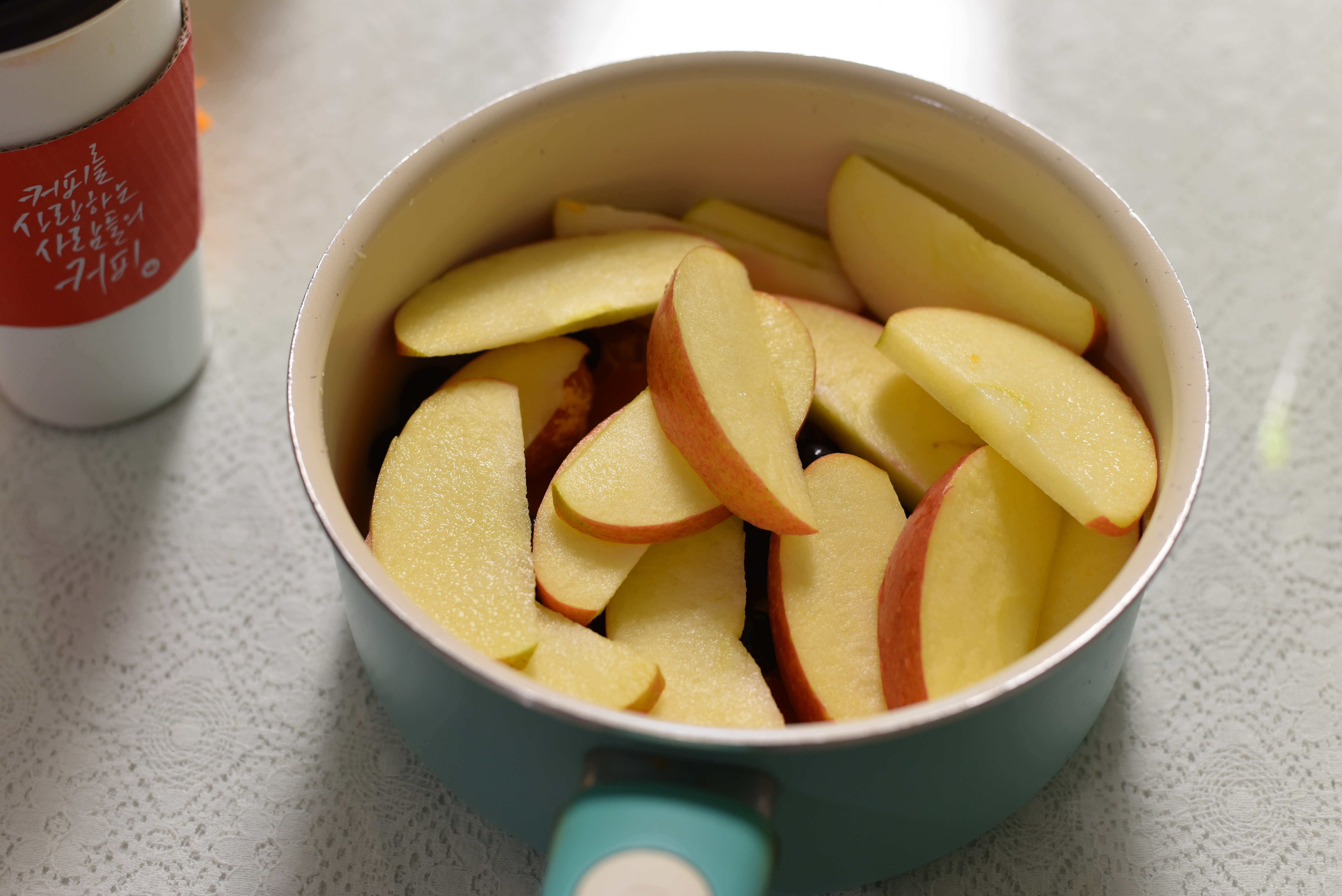 냄비에 준비한 귤과 블루베리, 그리고 깨끗히 씻은 사과를 잘라 넣어주었답니다. 잘게 썰어주면 과일의 즙들이 더 잘 베기 때문에 좋다고 해요~