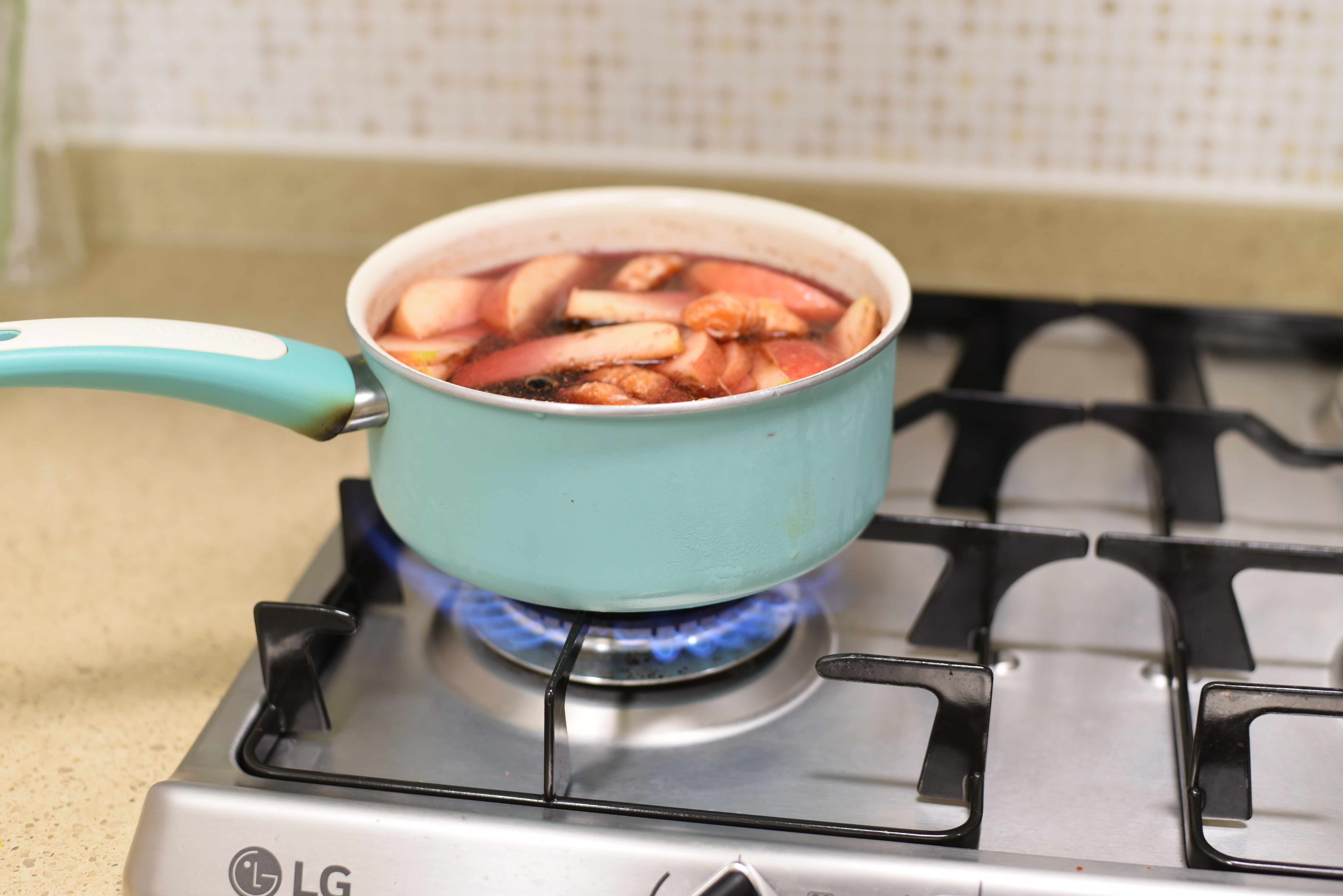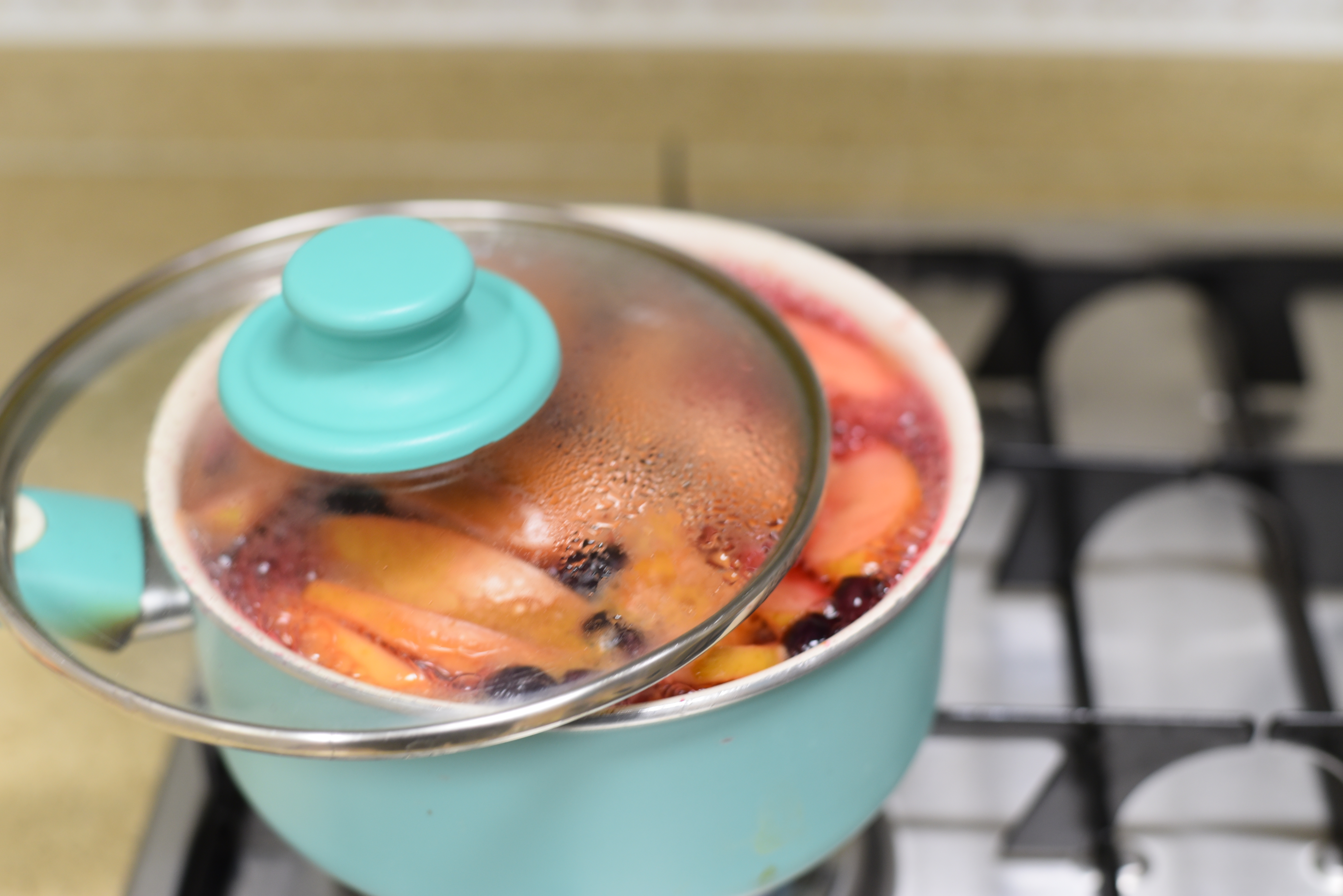 와인을 끓인 뒤에 30분 가량 뜸을 들여줍니다. 과일이 더 잘 베도록 숙성시켜주어요.