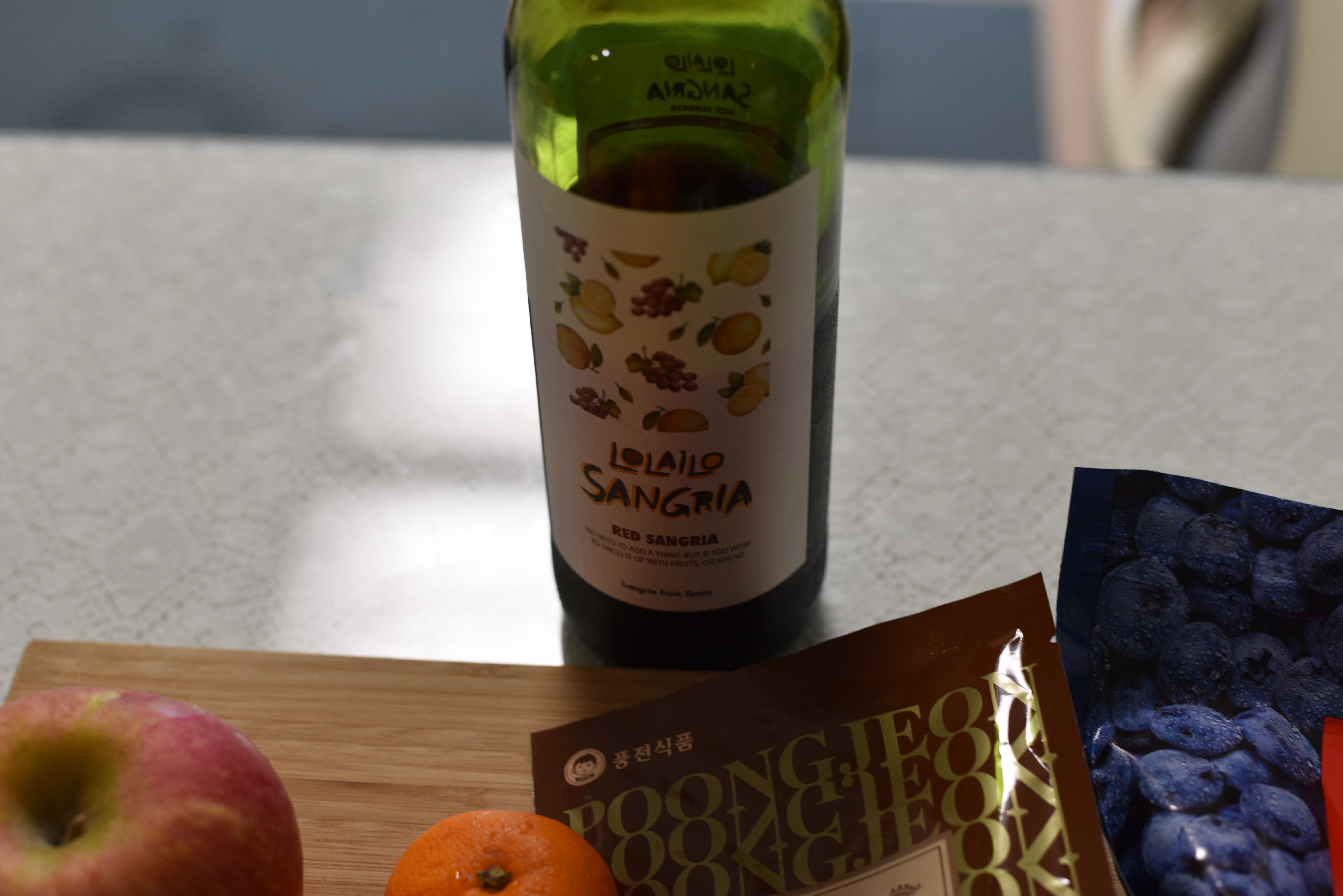 마트에 파는 저렴한 와인인 레드 상그리아 2/3 정도 남은 양을 넣어주었구요. 조금 모자란듯하여 남은 화이트 와인인 쿵푸걸 와인도 마저 넣어주었답니다. 둘이 합쳐서 와인 한병정도 될 것 같아요. 딱 적당한 양이였어요.