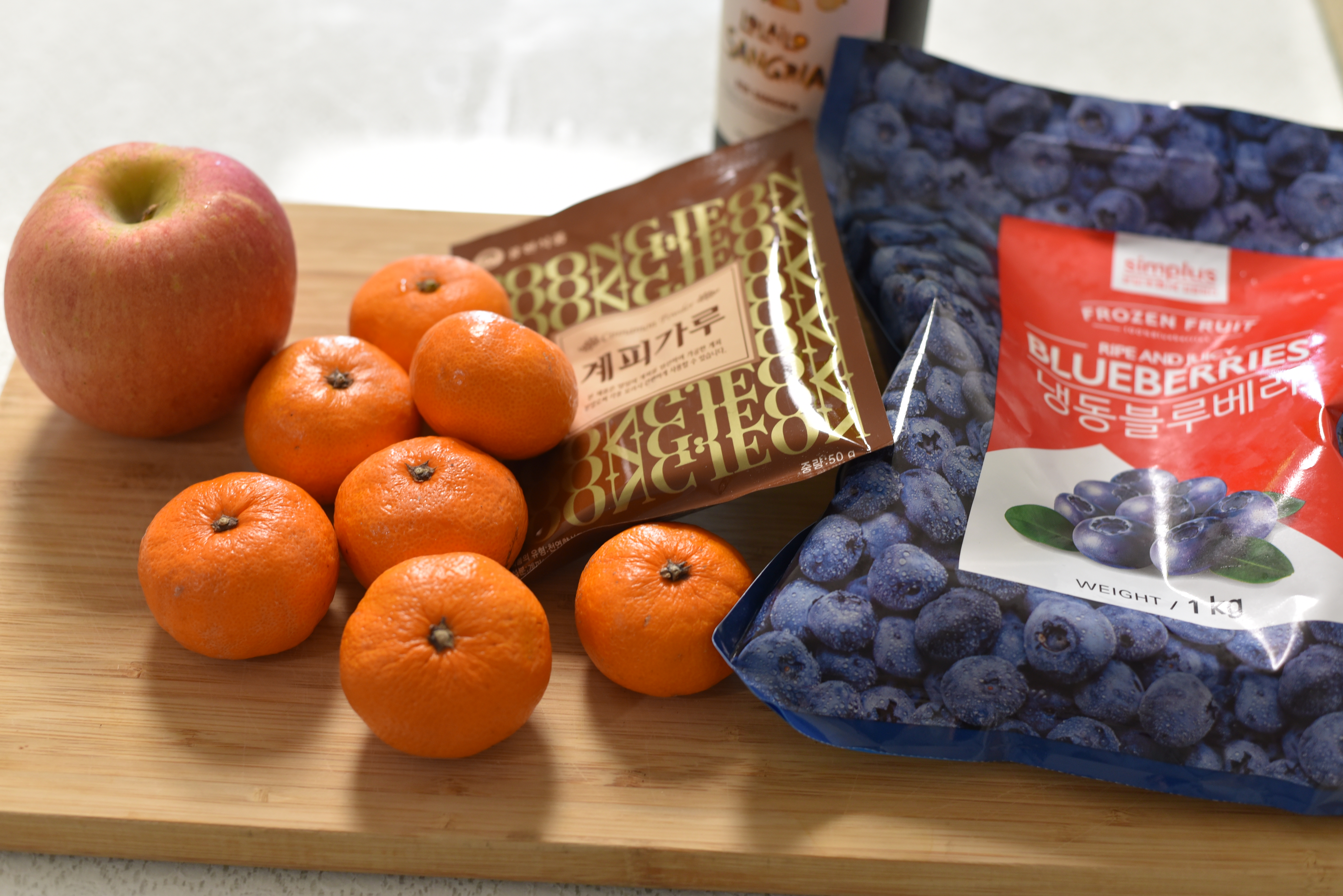사과 1개, 귤 4~5개, 블루베리 적당량, 레몬즙 4~5큰술, 계피가루 1/2ts, 생강즙 1ts, 설탕 2스푼입니다.