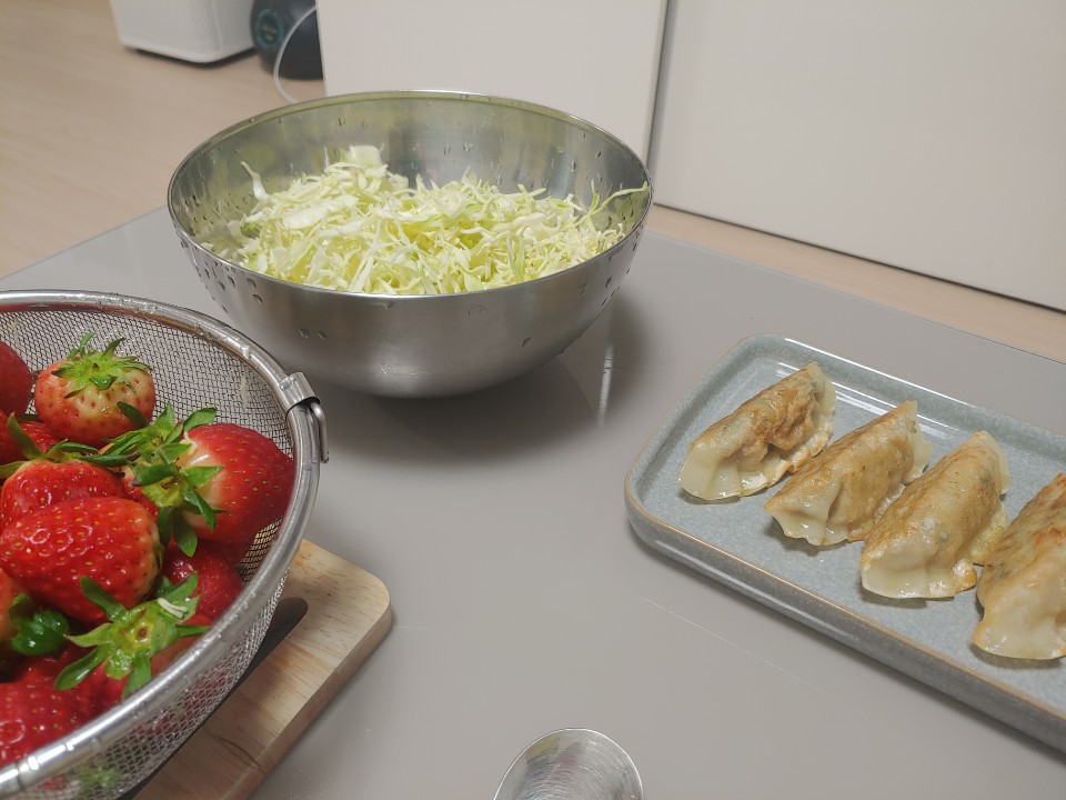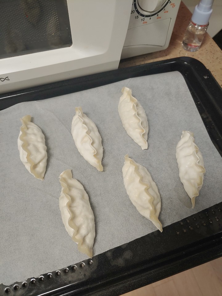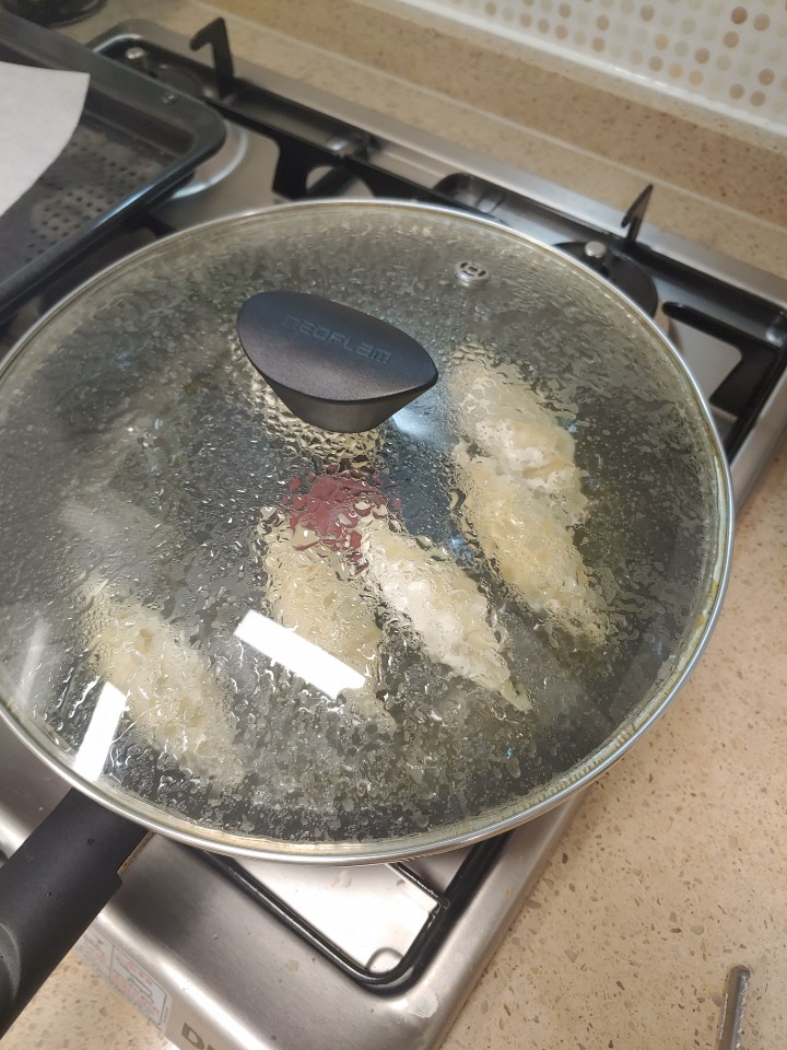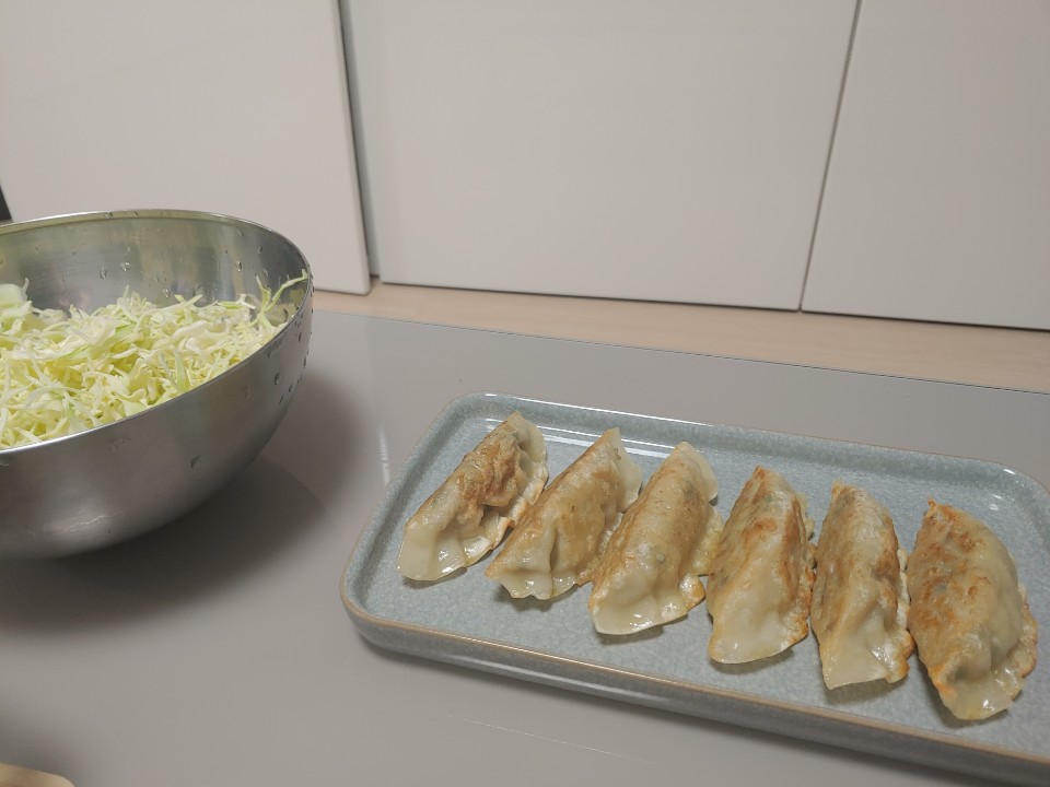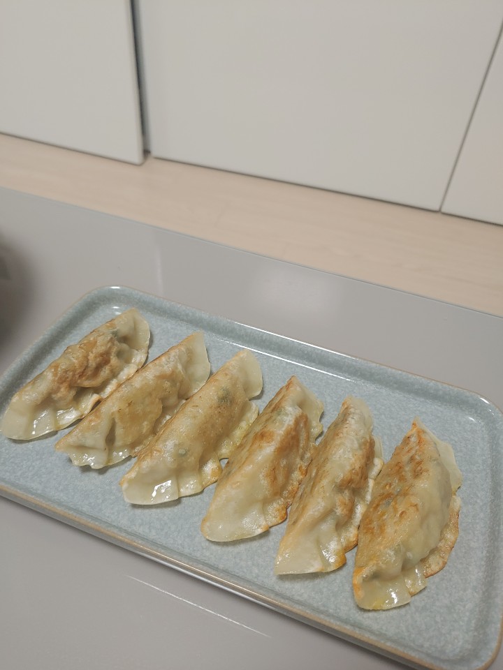 짜잔. 맛있게 구워졌네요. 맛은 찐만두를 구운 듯한 겉바속촉이에요. 엄청 쉬운 요리법이니까 꼭 따라해 보시는 것을 추천드려오. 냄새에 취해서 간장사진을 빠뜨렸지만 간장에 식초, 양파를 조금 썰어넣은 후 드시면 잘 어울린답니다.